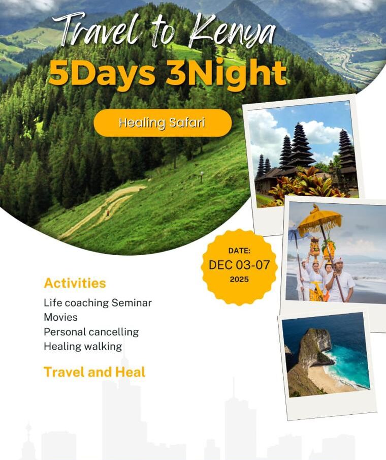 Join the Healing Vacation in Kenya from December 3–7, 2025. Explore Nairobi, Kisumu, and cultural heritage towns while enjoying guided tours, accommodation, meals, and activities—all for Tsh. 280,000. A journey of renewal, peace, and community.